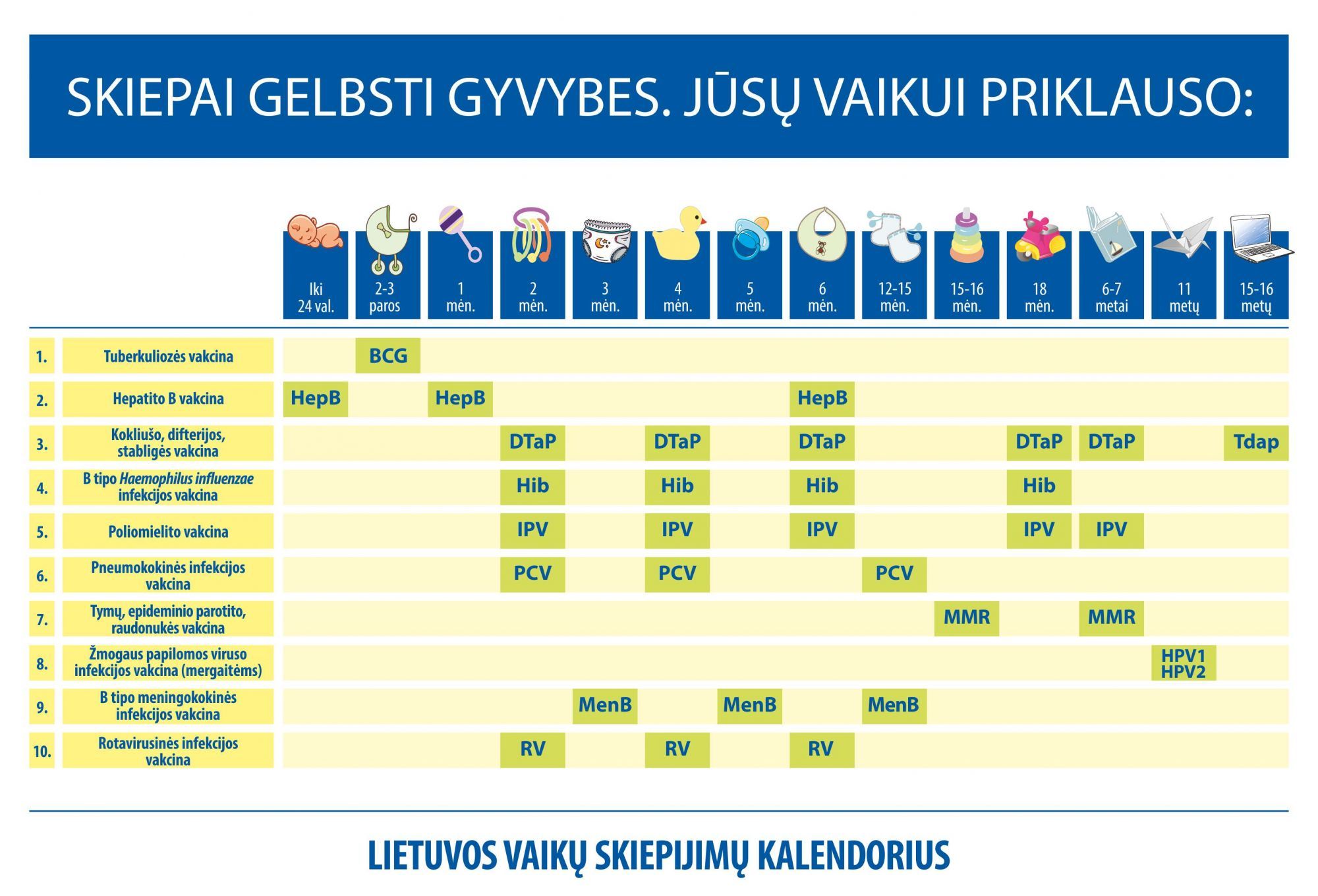 Lietuvoje pagal Vaikų profilaktinių skiepijimų kalendoriuje nustatytus terminus vaikai gydymo įstaigose yra nemokamai skiepijami nuo šių užkrečiamųjų ligų: tuberkuliozės, hepatito B, kokliušo, difterijos, stabligės, B tipo Haemophilus influenza infekcijos, poliomielito, tymų, epideminio parotito, raudonukės, pneumokokinės infekcijos, žmogaus papilomos viruso, rotaviruso, B tipo meningokoko. Už šiuos skiepus iš Privalomojo sveikatos draudimo fondo lėšų sumoka ligonių kasos.